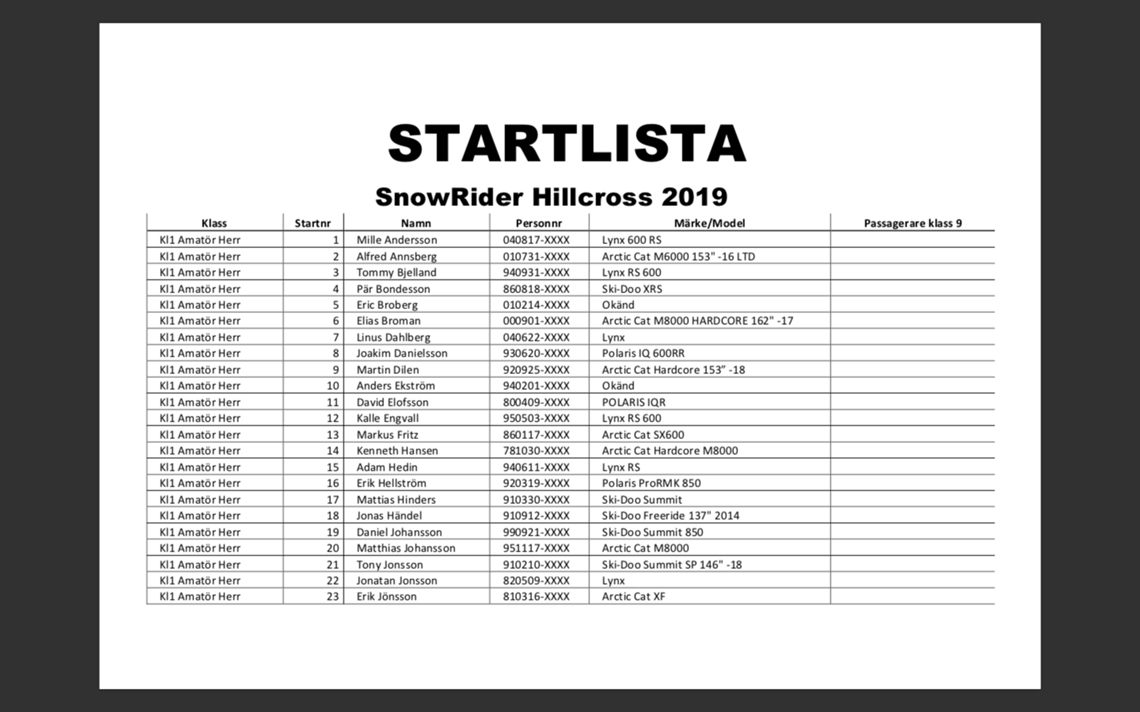 Startlista SnowRider Hillcross